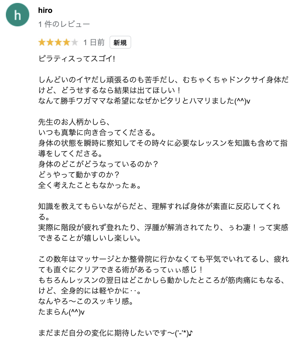 通わせて頂いて早4年半。足や肩なども加齢による故障などもなく日々元気に 2022 1/17 お客様の声 2022.01.05 2022.01.17 お客様の声 よかったらシェアしてね! URLをコピーする URLをコピーしました! URL Copied! この数年はマッサージとか整骨院に行かなくても平気でいれてるし、疲れても直ぐにクリアできる術があるってぃぃ感じ! 関連記事 身体のトレーナーはもちろん、心のトレーナーにもなっています 2022.01.17 この数年はマッサージとか整骨院に行かなくても平気でいれてるし、疲れても直ぐにクリアできる術があるってぃぃ感じ! 2022.01.17